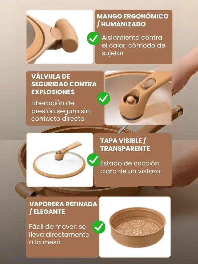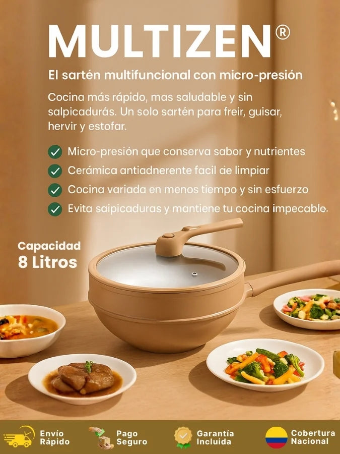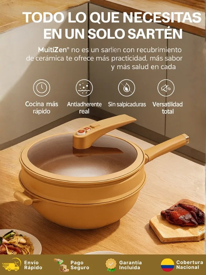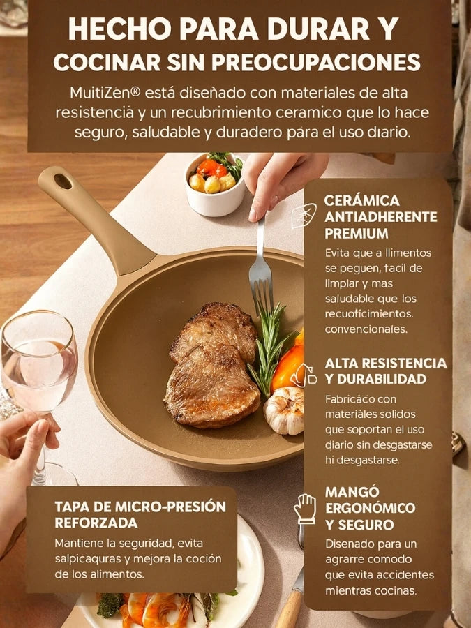 MultiZen® está fabricado con materiales de alta resistencia y un recubrimiento cerámico antiadherente premium, libre de tóxicos y seguro para la salud.