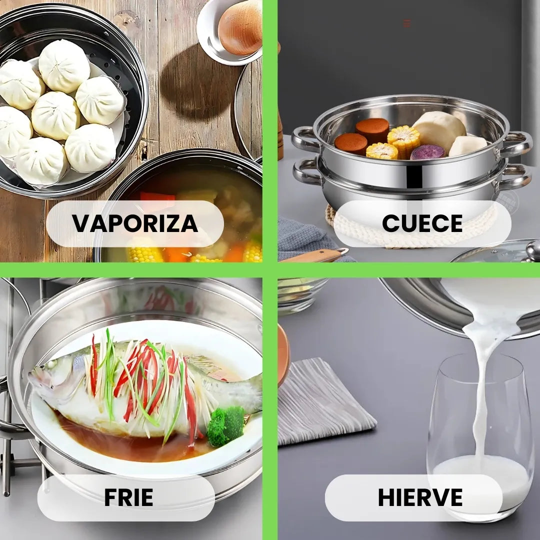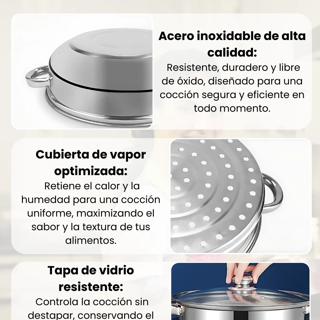 Sí, está diseñada para ajustarse perfectamente en la olla principal y en la vaporera, asegurando un sellado eficiente.